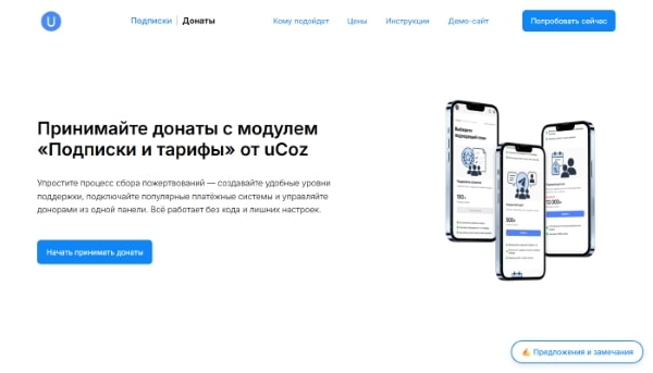 - uCoz.ru с модулем «Подписки и тарифы» – для создания своего сервиса по сбору донатов или с доступом на основе подписок, это может быть технически сложное решение, интегрированное с контентом вашего же сайта внутри конструктора uCoz.